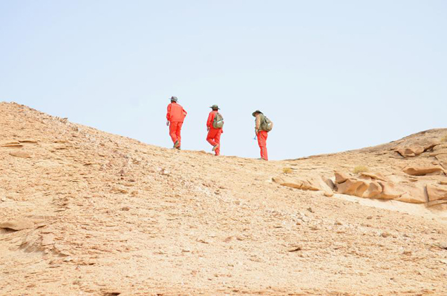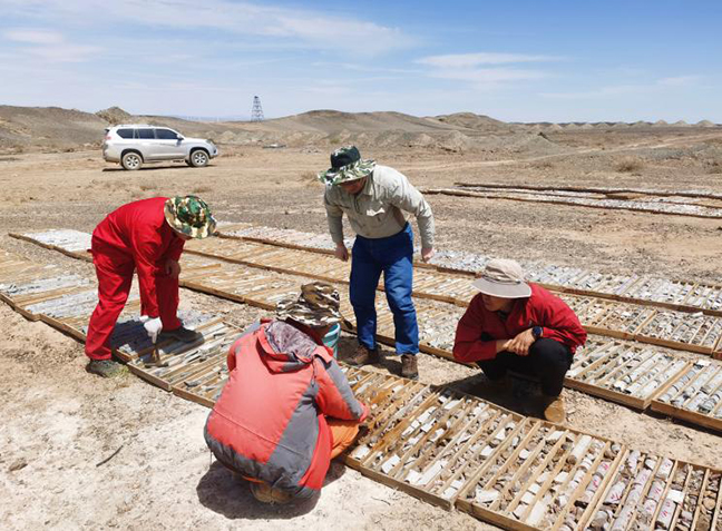 新疆鑫匯公司的野馬泉西金礦項目工作區(qū)距離哈密市155公里,工期為6-10月,需完成6千米的鉆探工作任務(wù)、16平方公里的地質(zhì)剖面等。礦區(qū)內(nèi)山丘連綿不絕,自7月開始,每天下午礦區(qū)地面溫度均超過普通溫度計的最高刻度,屬于“爆表”狀態(tài)。因工作任務(wù)緊,地質(zhì)隊員們每天早上7點出發(fā),中午之前要返回基地,傍晚重新出發(fā),22點前趕回基地,開展剖面測量和鉆探編錄工作,以避開正午的酷熱。為了不被灼傷,地質(zhì)隊員和鉆探工人把自己包裹得嚴嚴實實,手拎地質(zhì)錘敲下每一個礦化線索,身背樣品包裝載好沉甸甸的希望。汗水浸濕衣衫,腳底磨出老繭,他們踏遍了礦區(qū)的角角落落,最終繪制出整個礦區(qū)的礦化藍圖。