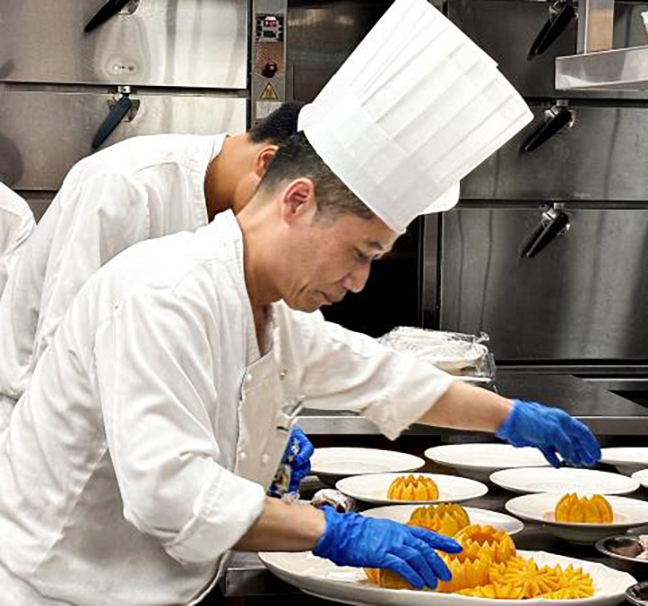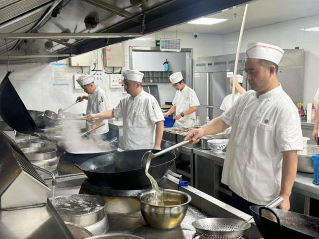 在鹽城迎賓館、國投大酒店、鹽城萬豪酒店,后廚內(nèi)各類蒸煮設(shè)備持續(xù)釋放出熱氣。為了客人味蕾的享受,在高達四五十攝氏度的廚房里,廚師們在灶臺前忙活,耐心細致地烹飪著每一道菜肴,洗鍋、倒油、下主料、添配菜,他們一手端著鐵鍋,一手用力翻炒,炙熱的火焰不時從鍋中竄出。對于廚師來說,每年7月到9月都是一場漫長的考驗,由于大部分后廚油煙大,不適合安裝空調(diào),用大功率風扇又會影響烹飪,所以廚師們的工作服幾乎都是濕的,而正是因為有了他們在高溫下的執(zhí)著堅守,才有了滿足人們味蕾的美味菜肴。