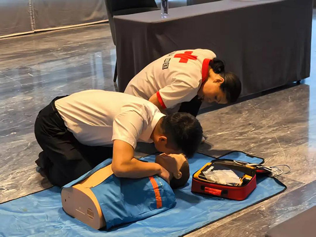 積極探索創(chuàng)新安全管理模式,通過跨界合作、全員參與,提升安全管理效能。國投物業(yè)公司與鹽城市亭湖區(qū)紅十字會攜手,在鹽城先鋒中心項目創(chuàng)新開展“消防+急救”雙場景聯(lián)動演練?;顒犹匮t十字會專家現(xiàn)場授課,圍繞心肺復蘇(CPR)、AED 使用、海姆立克急救法等急救技能展開詳細講解與實操指導。