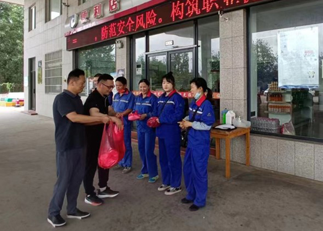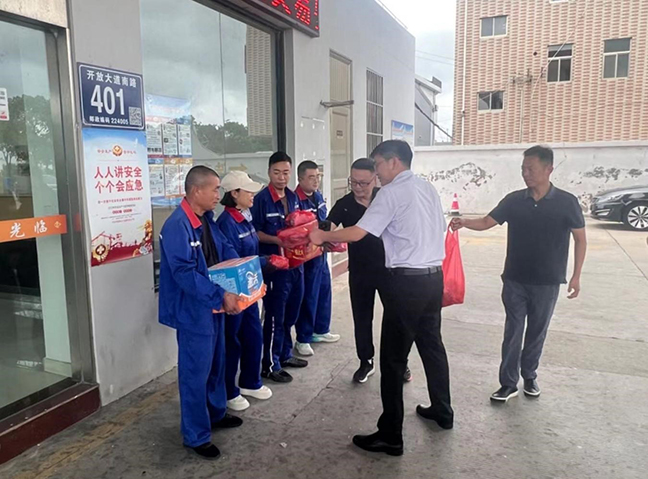活動(dòng)中,物資集團(tuán)和新倫石化公司負(fù)責(zé)人一行來到大徐、金達(dá)加油站,為一線職工送上防暑降溫物品,關(guān)切詢問大家的日常工作情況,叮囑他們在高溫期間要合理安排作業(yè)時(shí)間,注重勞逸結(jié)合,做好個(gè)人防護(hù)。隨后,物資集團(tuán)負(fù)責(zé)人詳細(xì)了解加油站經(jīng)營銷售情況,并要求現(xiàn)場管理人員切實(shí)做好防暑降溫措施和防汛工作,加強(qiáng)對加油機(jī)、油罐區(qū)、配電室等設(shè)備設(shè)施的日常巡查,及時(shí)消除安全隱患,營造平安穩(wěn)定的工作環(huán)境。