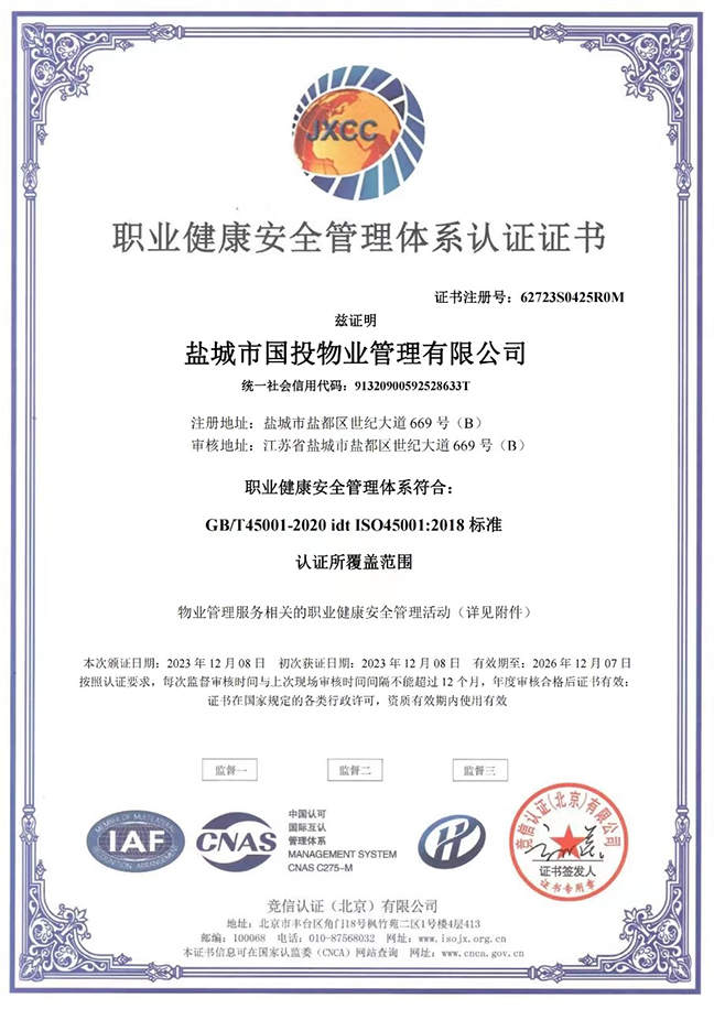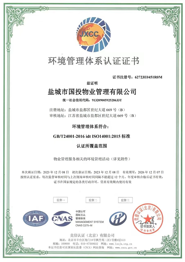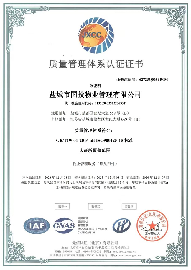 日前,鹽城國投物業(yè)公司順利取得ISO“三體系”(ISO9001質(zhì)量管理體系、ISO14001環(huán)境管理體系、ISO45001職業(yè)健康安全管理體系)認證證書。這是公司在提升企業(yè)綜合實力過程中取得的新進展,標志著公司在精細化、制度化、規(guī)范化管理方面邁上新臺階。