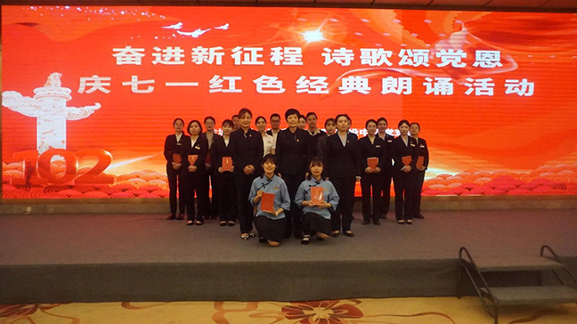 為慶祝中國共產(chǎn)黨成立102周年,弘揚(yáng)偉大建黨精神,抒發(fā)愛黨愛國情懷,6月29日下午,鹽城國投大酒店黨支部聯(lián)合國投中科黨支部以“奮進(jìn)新征程 詩歌頌黨恩”為主題,開展了慶“七一”紅色經(jīng)典誦讀活動。